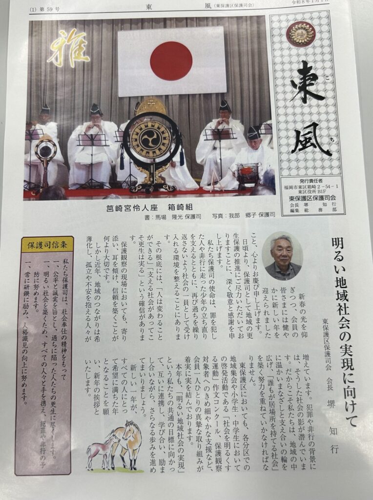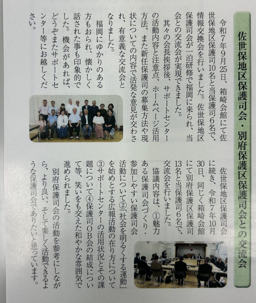 行事紹介 ホーム » 行事紹介 » 東保護区保護司会の情報誌「東風」に掲載されました。 東保護区保護司会の情報誌「東風」に掲載されました。 令和7年9月25日、研修で、東保護区保護司会と情報交換会を行いました。 佐世保地区保護司会10名 行事紹介一覧